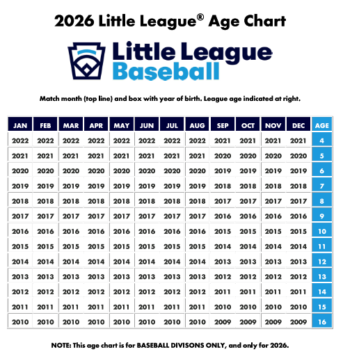 *Please be advised that 6-year-old Tee Ball players, 8-year-old Rookies players and 10-year-old AA players may play up to the next league if they prefer.